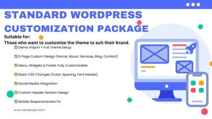 ✅ WordPress install ✅ Demo Import + Full Theme Setup ✅ 5 Page Custom Design (Home, About, Services, Blog, Contact) ✅ Menu, Widgets & Footer Fully Customizable ✅ Basic CSS Changes (Color, Spacing, Font tweaks) ✅ Social Media Integration ✅ Custom Header Section Design ✅ Mobile Responsiveness Fix